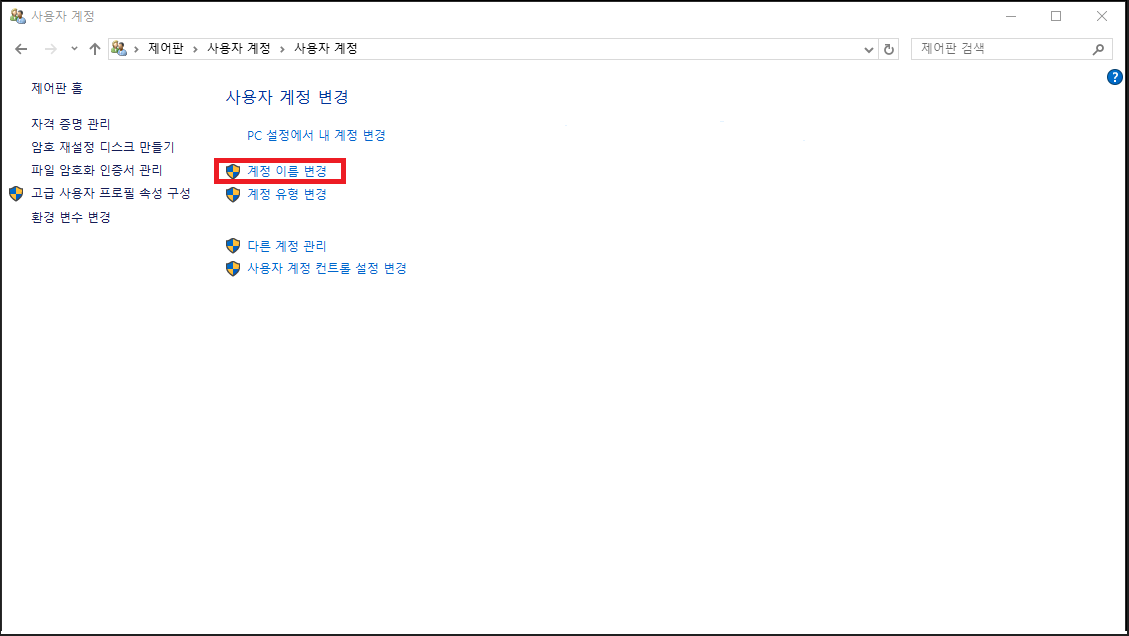 - [사용자 계정] 화면에서 [계정 이름 변경] 링크를 클릭합니다.