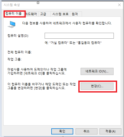 [시스템 속성] 창이 열렸다면, 여기서 네트워크에서 인식되는 PC 이름을 변경할 수 있습니다.