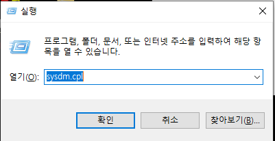 - 다시 **[Win + R]**을 누르고 **sysdm.cpl**을 입력하여 시스템 속성 창을 엽니다.