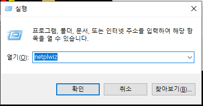 - 명령어 입력: 실행 창에 **netplwiz**를 입력한 후 [확인] 또는 Enter 키를 누릅니다.
