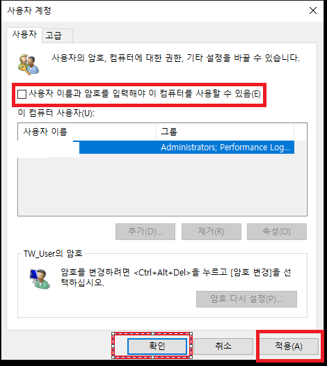 [사용자 계정] 창에서 가장 핵심적인 자동 로그인 설정 옵션을 해제해야 합니다.